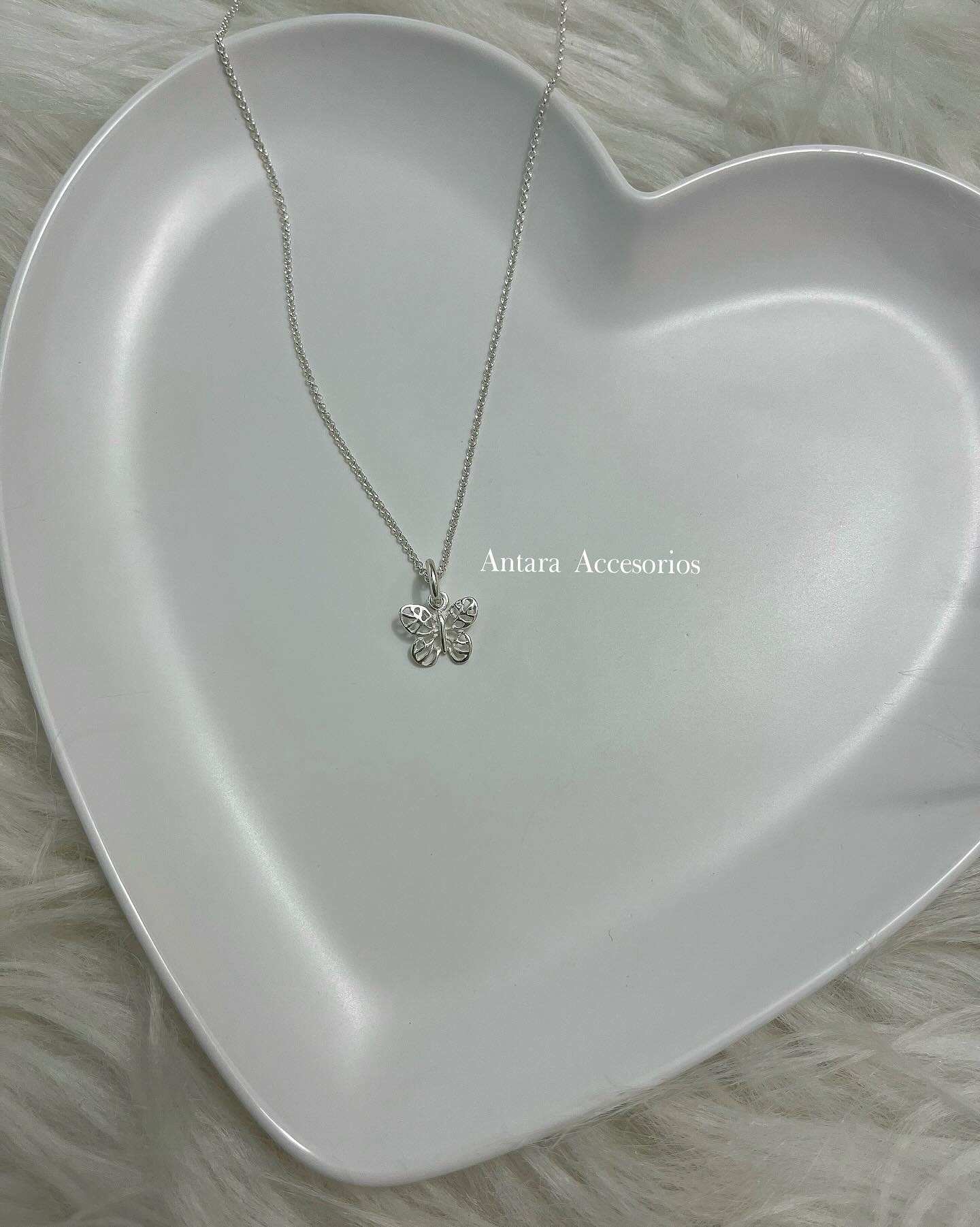 Cadena de eslabones ovalados elaborada en plata 950 con dije en forma de silueta de mariposa elaborado en plata 950.