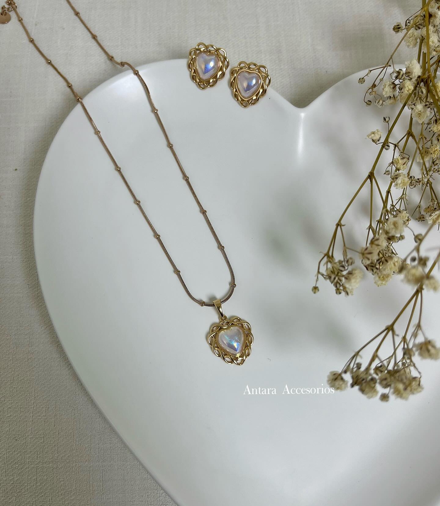 Dúo odette! Contiene collar y aretes. Material acero quirúrgico bañado en oro rose . ¡Mójalo sin miedo! El centro de ambas joyitas es tornasolado.