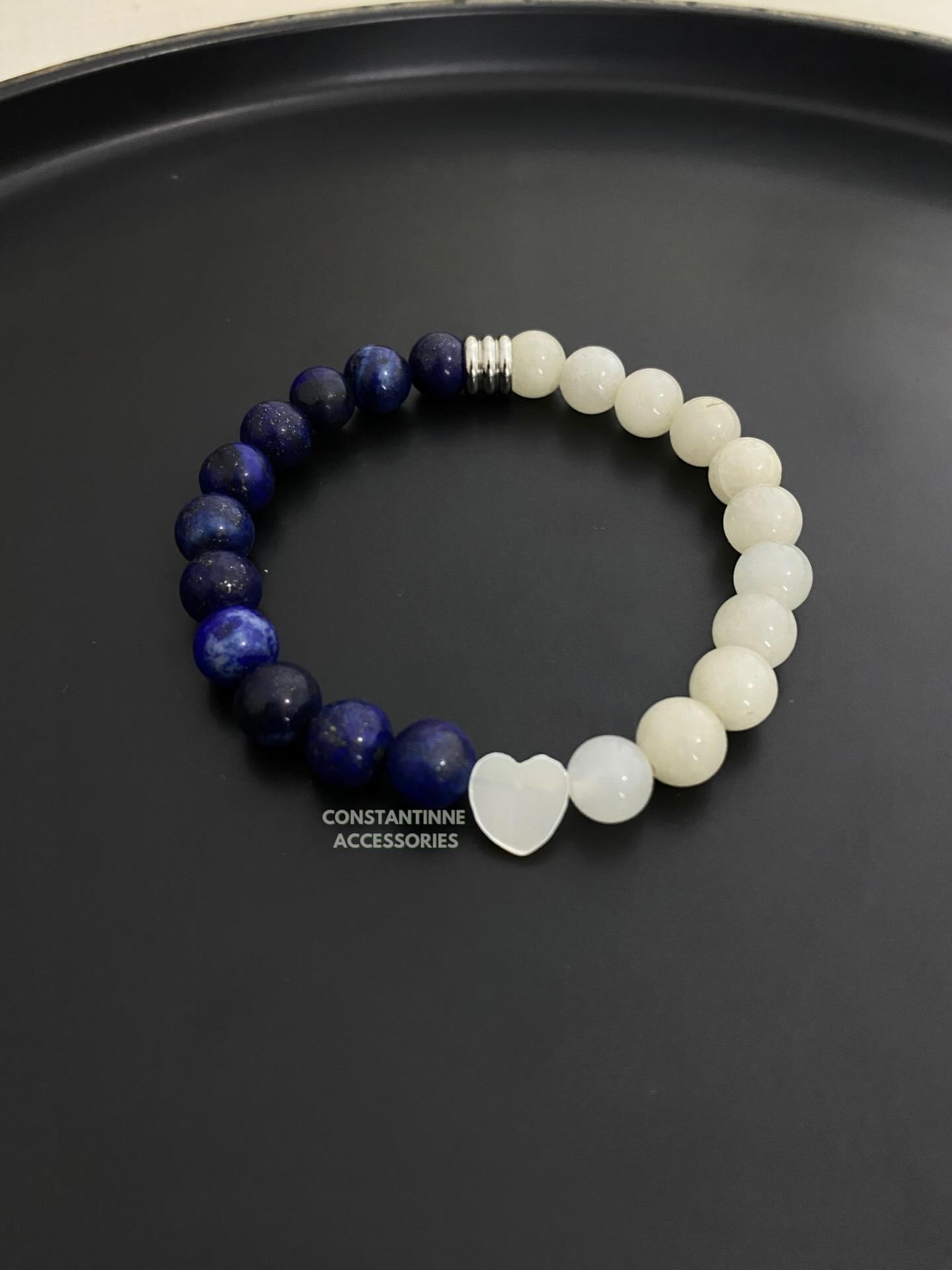 Pulsera hecha con piedras naturales en tonos azules y blancos con dije de acero inoxidable.